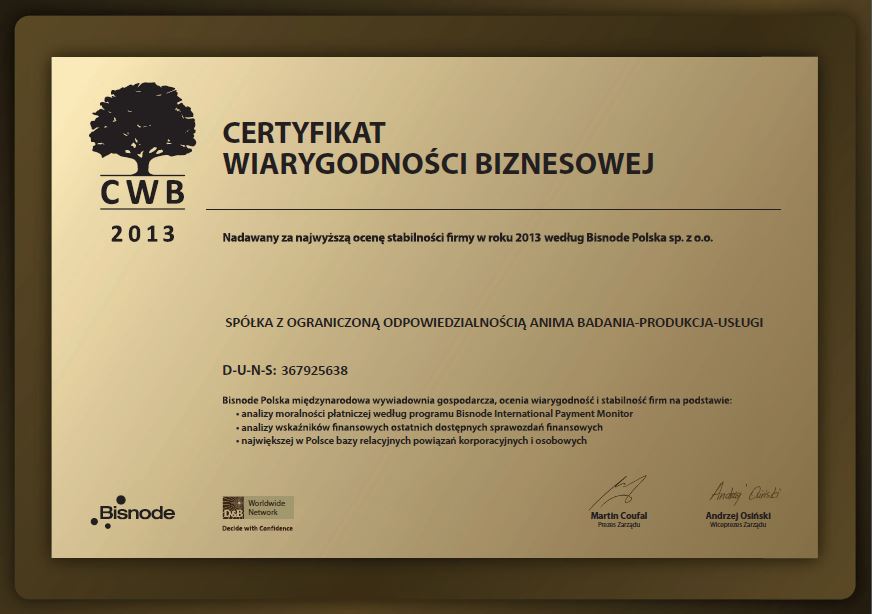 ANIMA otrzymała Certyfikat Wiarygodności Biznesowej nadawany na podstawie danych finansowych z roku 2013. Bisnode Polska, wiodąca na rynku wywiadownia gospodarcza uhonorowała wiarygodność biznesową firmy ANIMA. Do grona nagrodzonych należą firmy o najwyższej i wysokiej ocenie stabilności wystawianej przez Bisnode Polska.